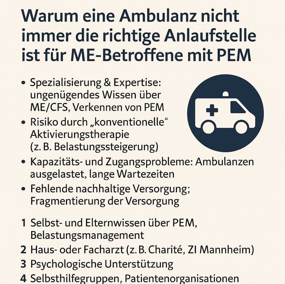 ➡️ Viele Ambulanzen sind Post‑Covid‑Ambulanzen, die eine breite Palette von Long‑Covid Beschwerden behandeln. Nicht alle haben tiefgehendes Wissen über die speziellen Pathomechanismen von ME oder die Besonderheit von PEM.